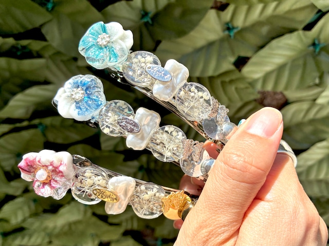 ご覧頂きありがとうございます♡ ストーン、レジン、ビーズ、パール、押し花使用。 真ん中の押し花のカラーリングに合わせて 光の加減でキラキラ光るようなデザインに仕上げました✳︎ 約8センチのバレッタなので、ひとつにまとめる時も簡単にまとめられますよ◎ 【発送について】 ご注文いただいて、オーダー品を除き、5日以内に発送します。 お急ぎであれば相談してください。 【包装について】 ラッピングをご希望される場合はコメントをください! 丁寧に包装させていただきます。 ※添付画像参照 【お得情報】 おまとめ買いで割引あり◎ プロフィールの詳細をご確認の上、 まとめ買い希望のお客様は購入される前に コメントください。 購入される前にプロフィールをご覧ください*