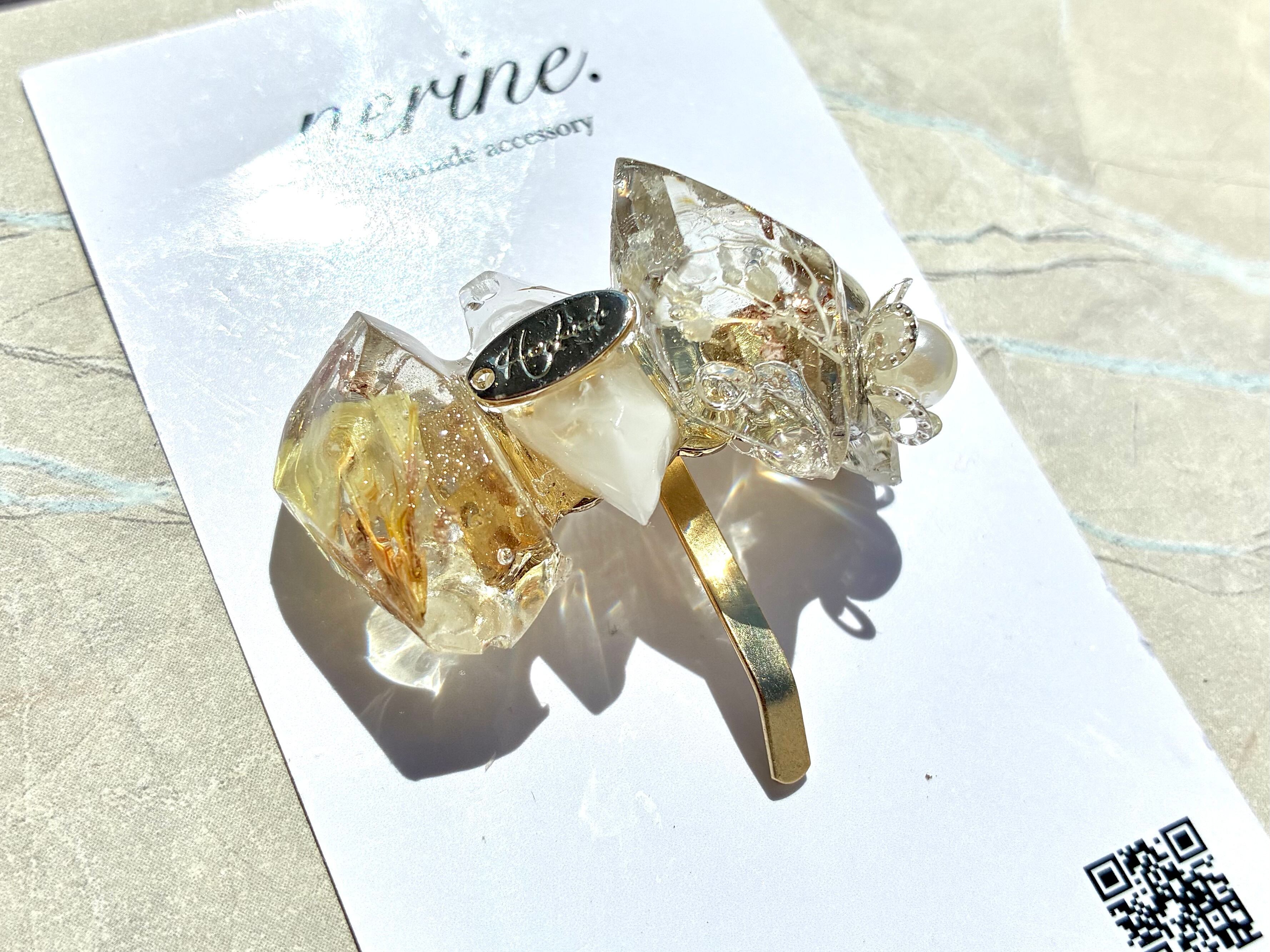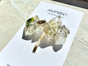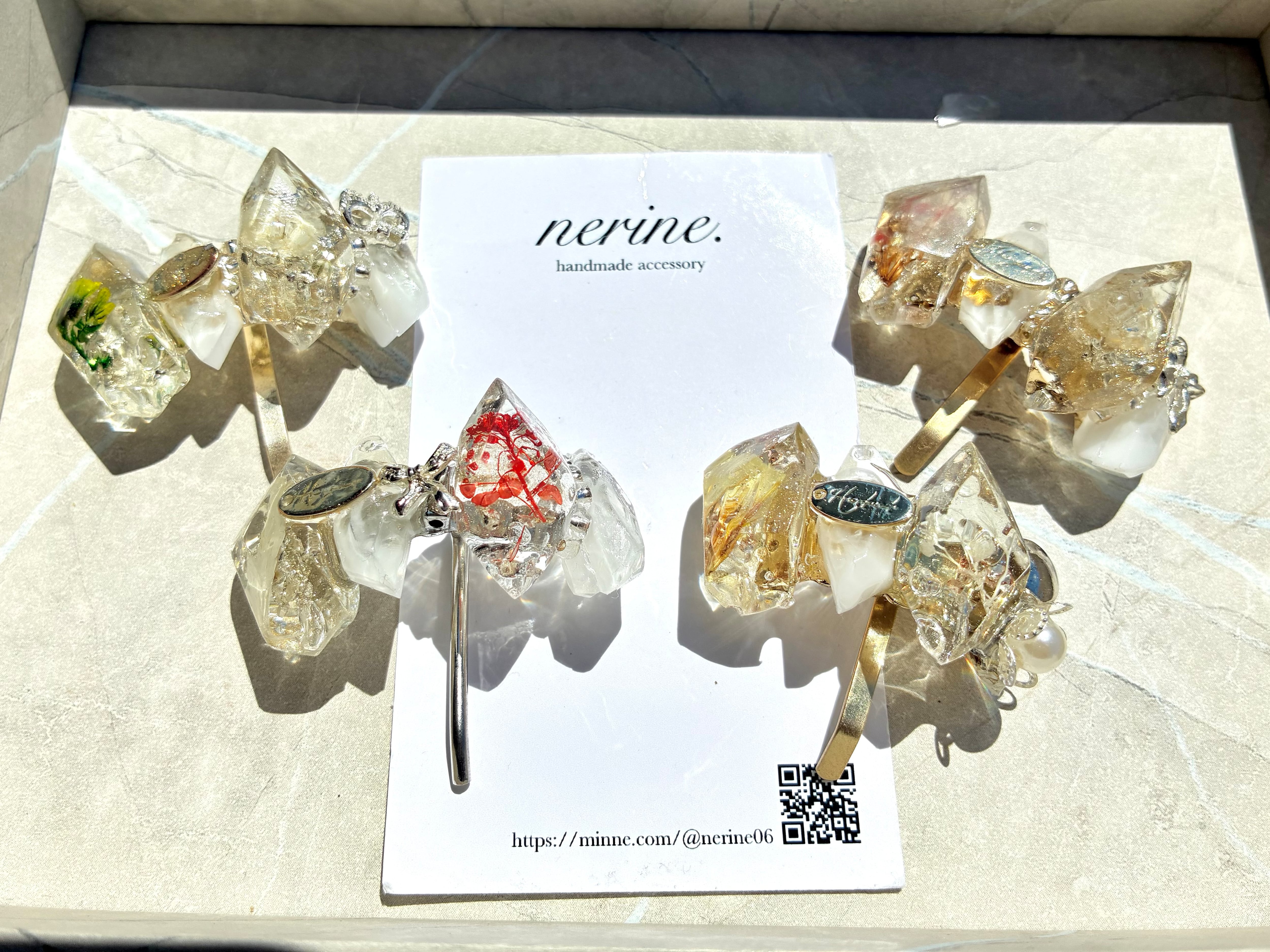 ストーン、レジン、クリアパーツ、ドライフラワー、ビーズ使用。