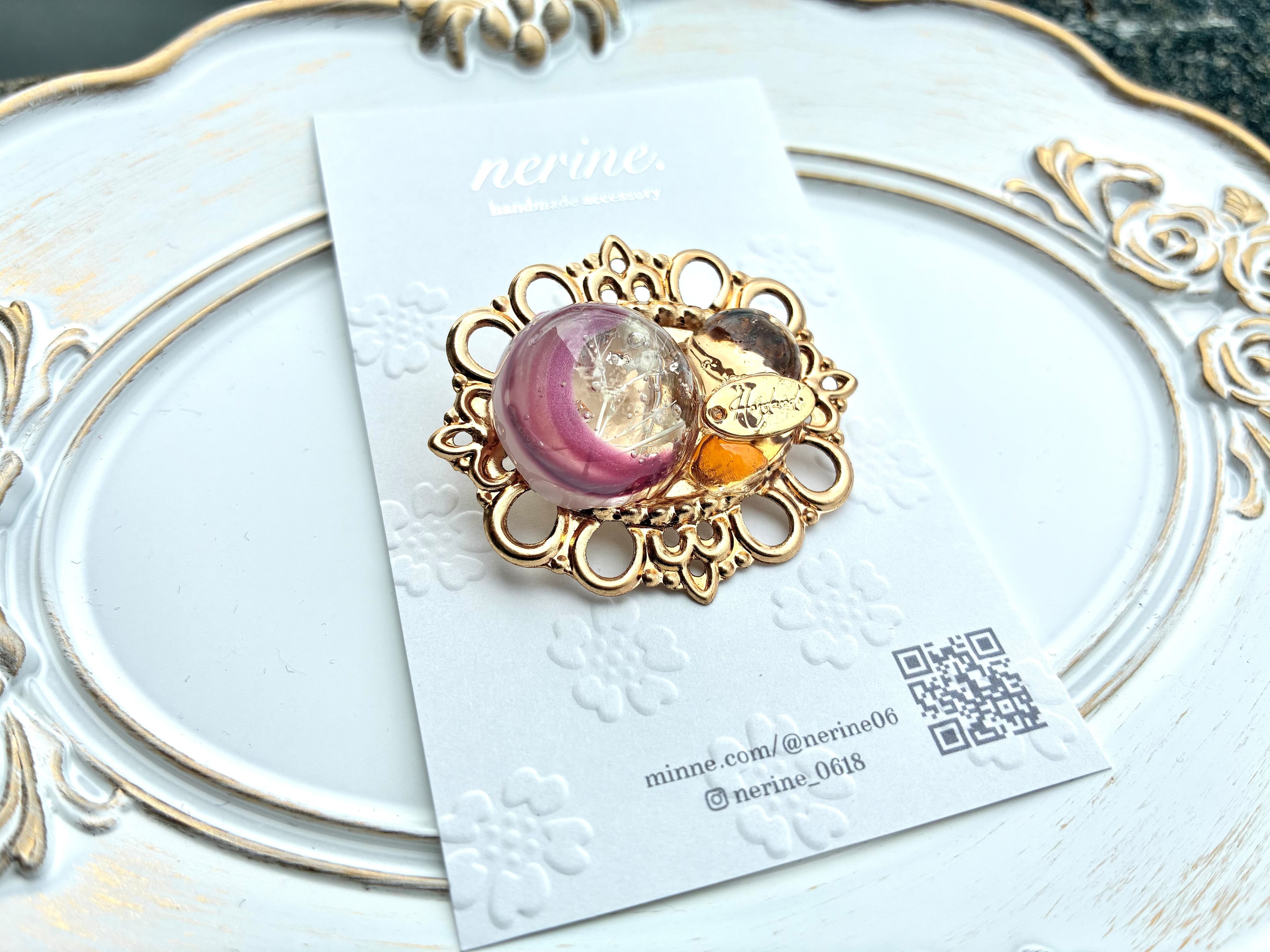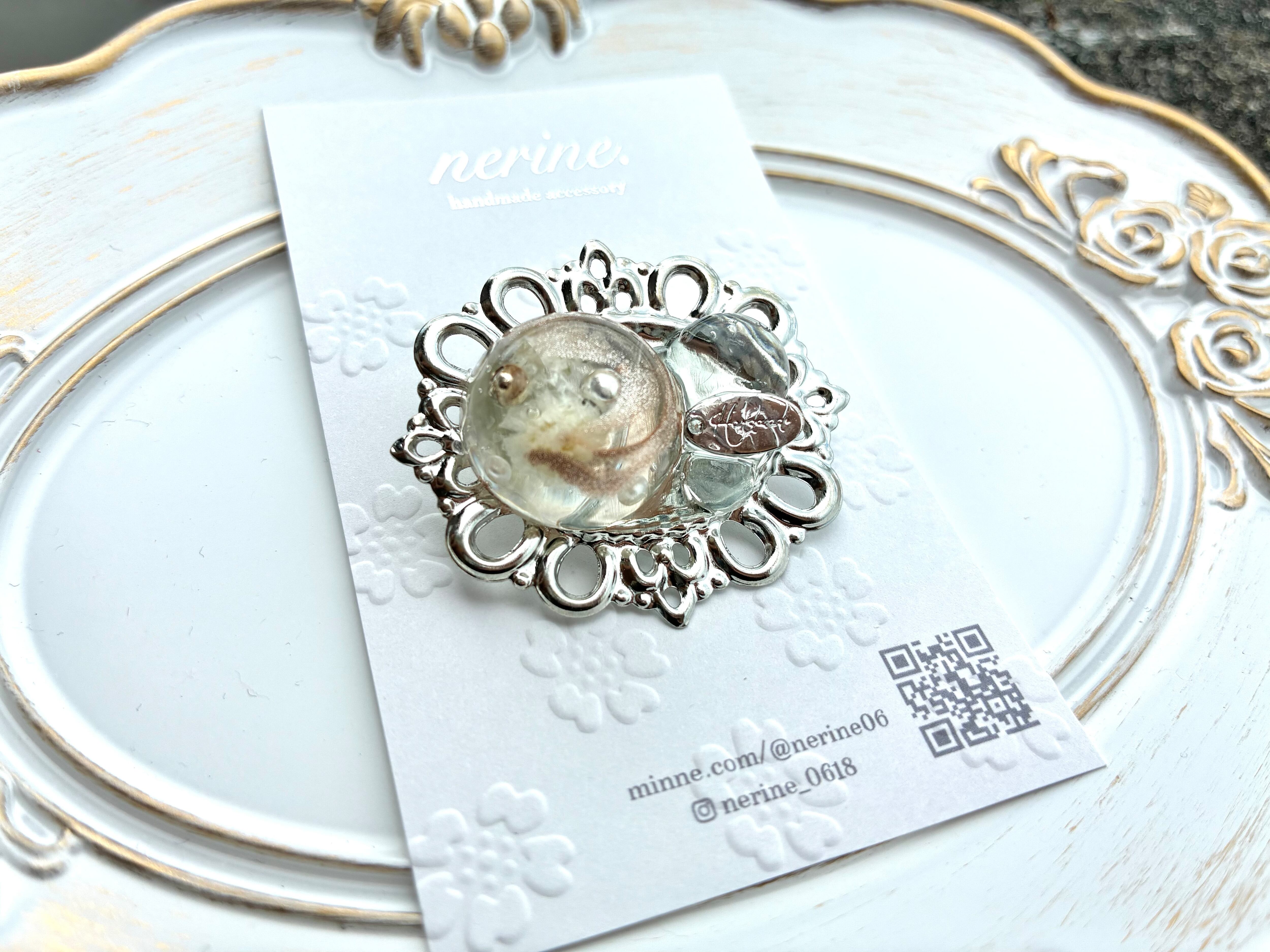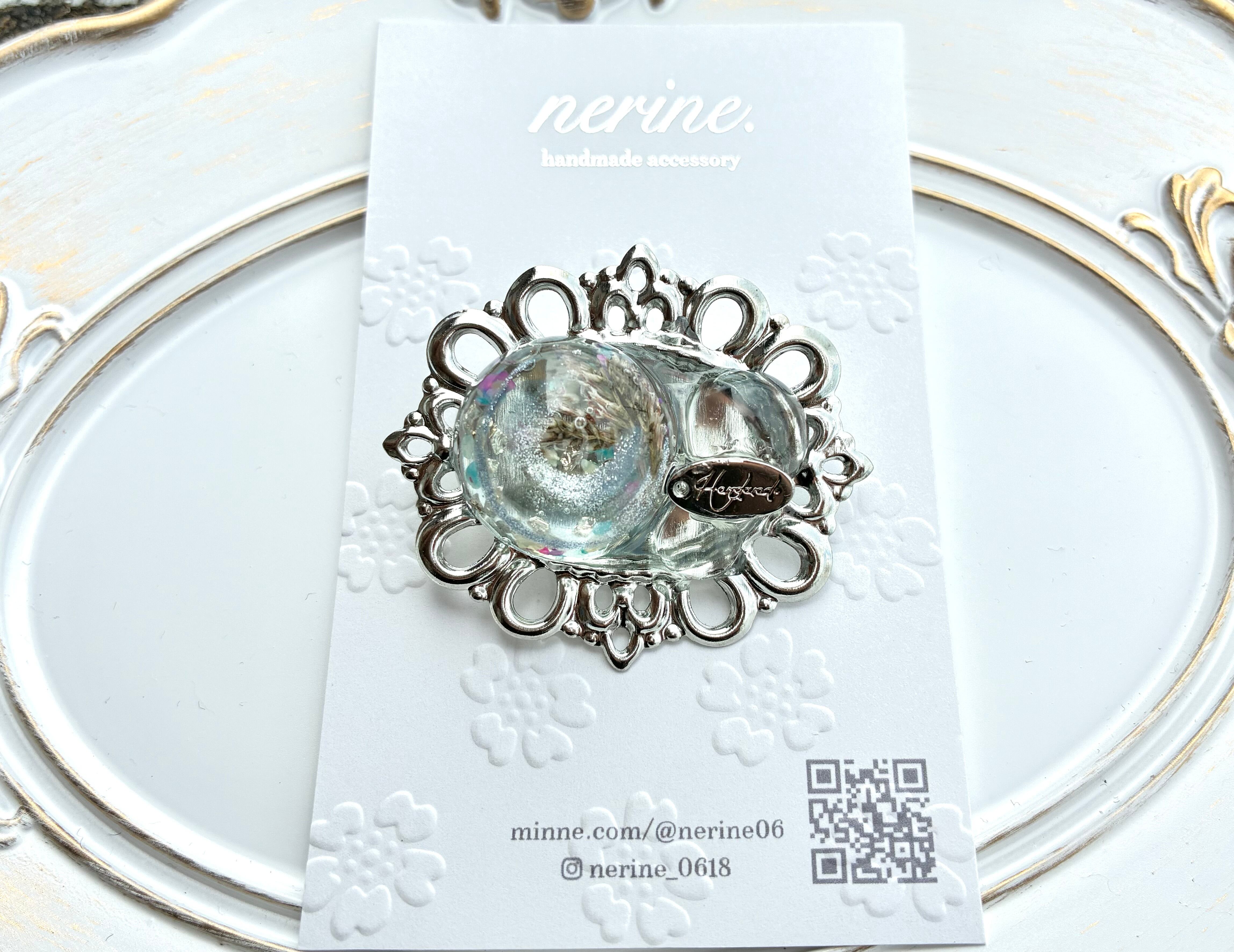 ドライフラワー、パール、レジン、クリアパーツ使用。
