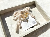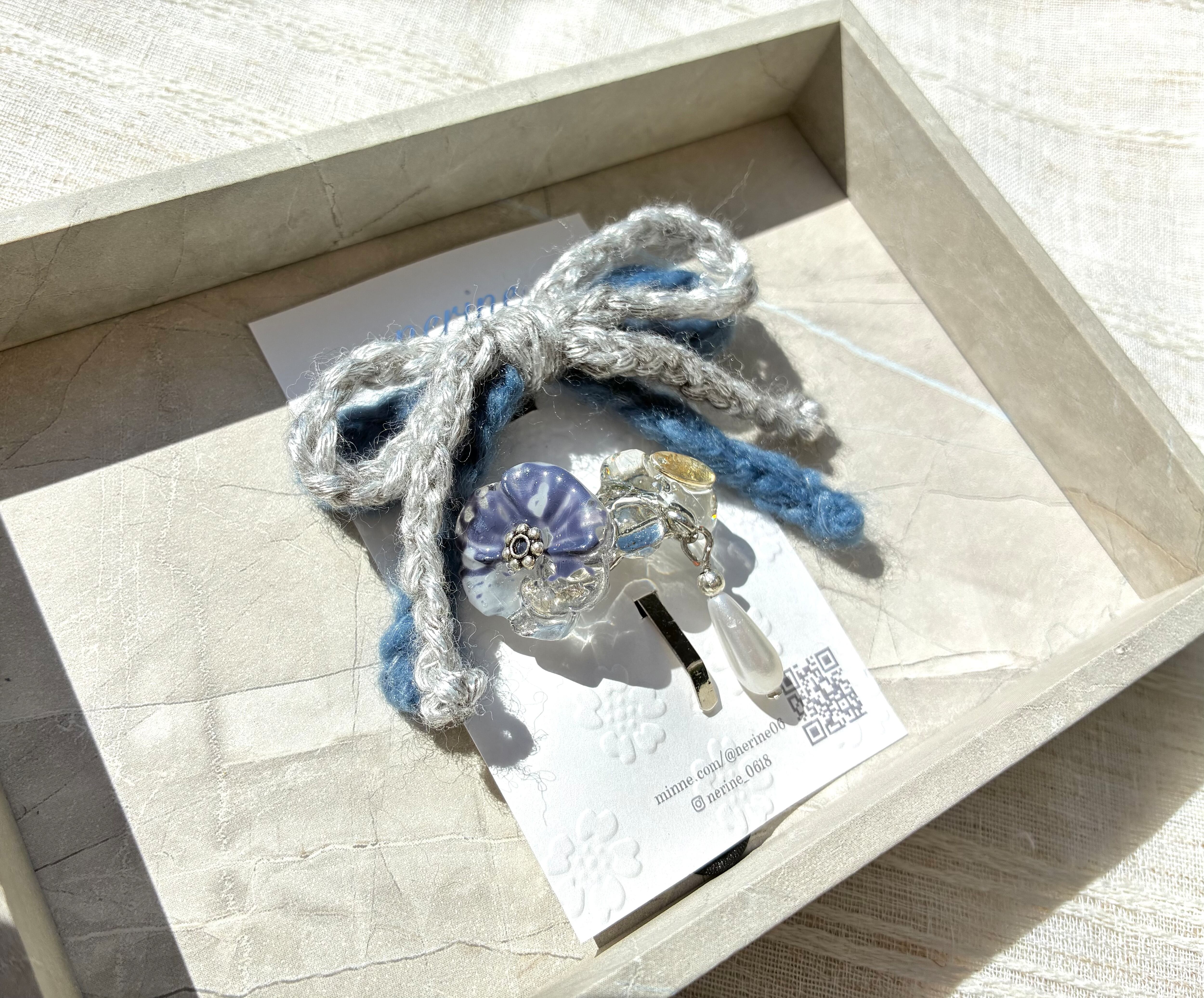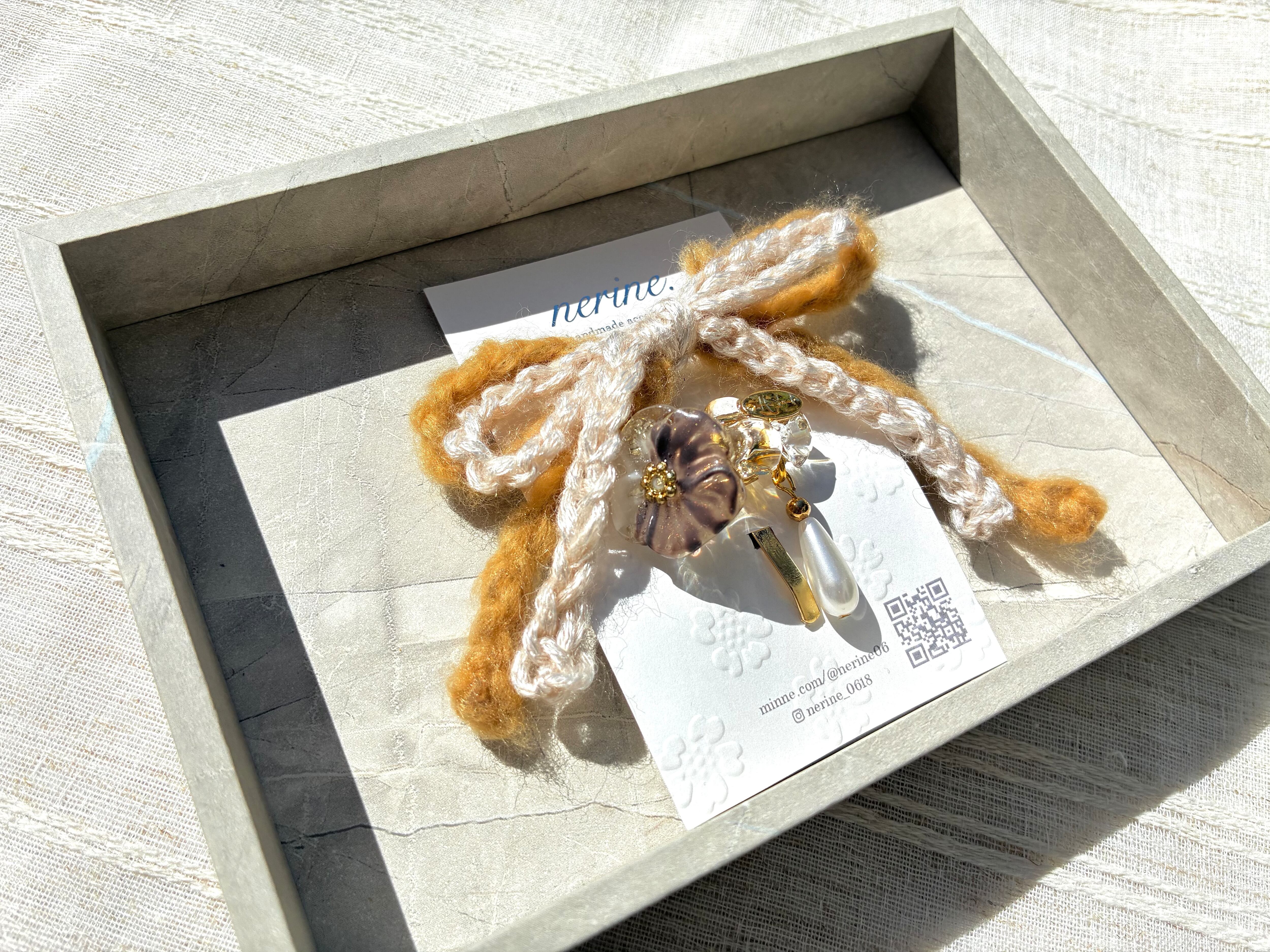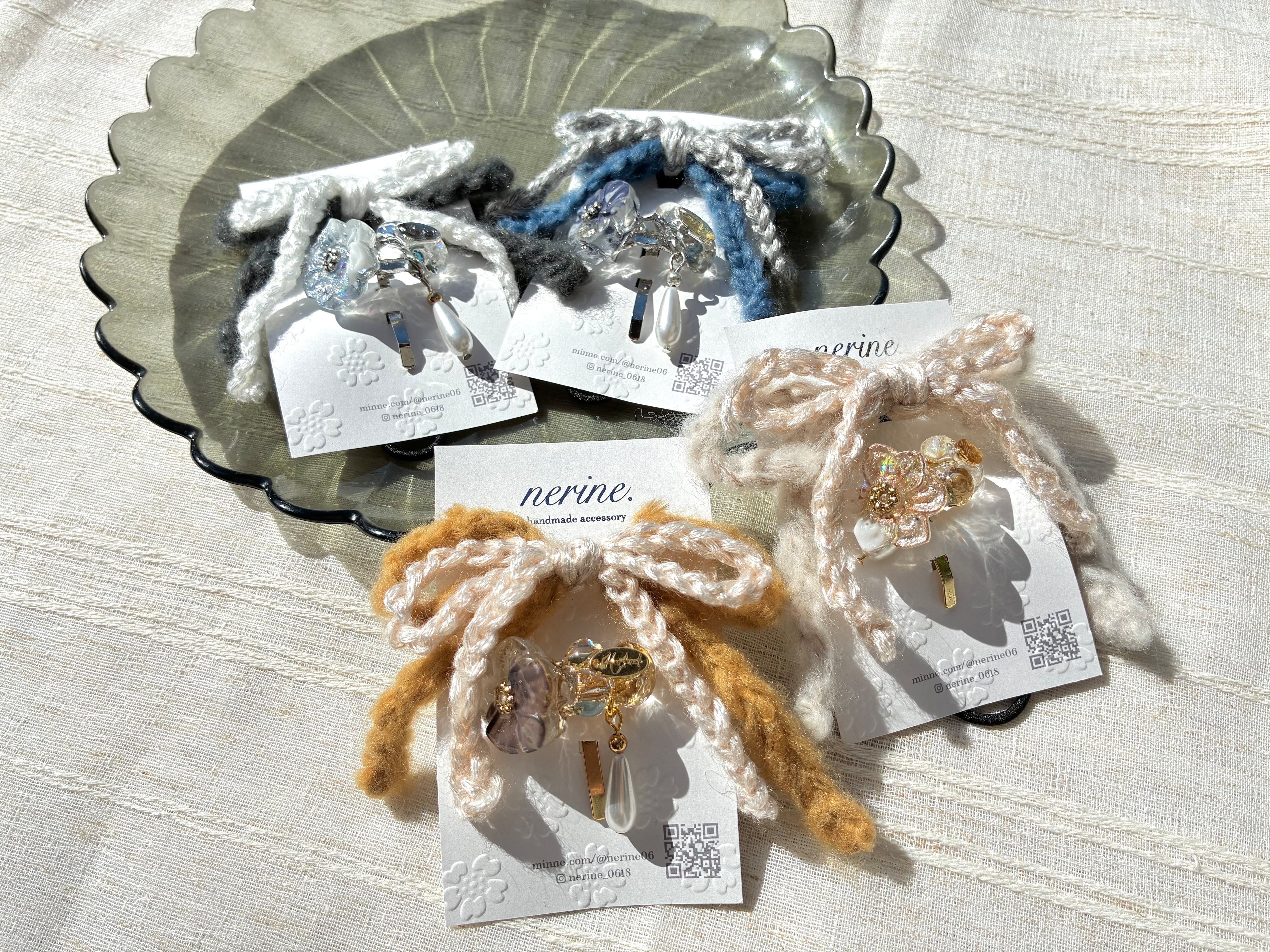 ヘアゴムは艶感のある毛糸と季節感のでる毛糸を合わせてフェミニンなデザインに。